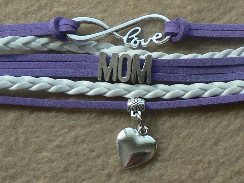 Here is a Mom Wrap Bracelet. The bracelet is Purple and White Color. The Bracelet is 6 1/2" long with a 2" extension chain. There is a infinity love charm on the top of the bracelet and heart charm on bottom. In the middle of the bracelet there is silver color letter that say Mom.