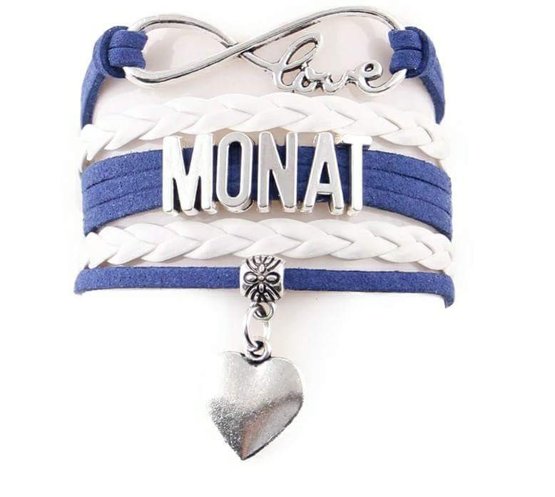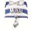 Monat Wrapped Bracelet. This Bracelet is White and Light Navy Blue. With silver charms. The bracelets come with a adjustable links that will fit up to a 9" wrist.