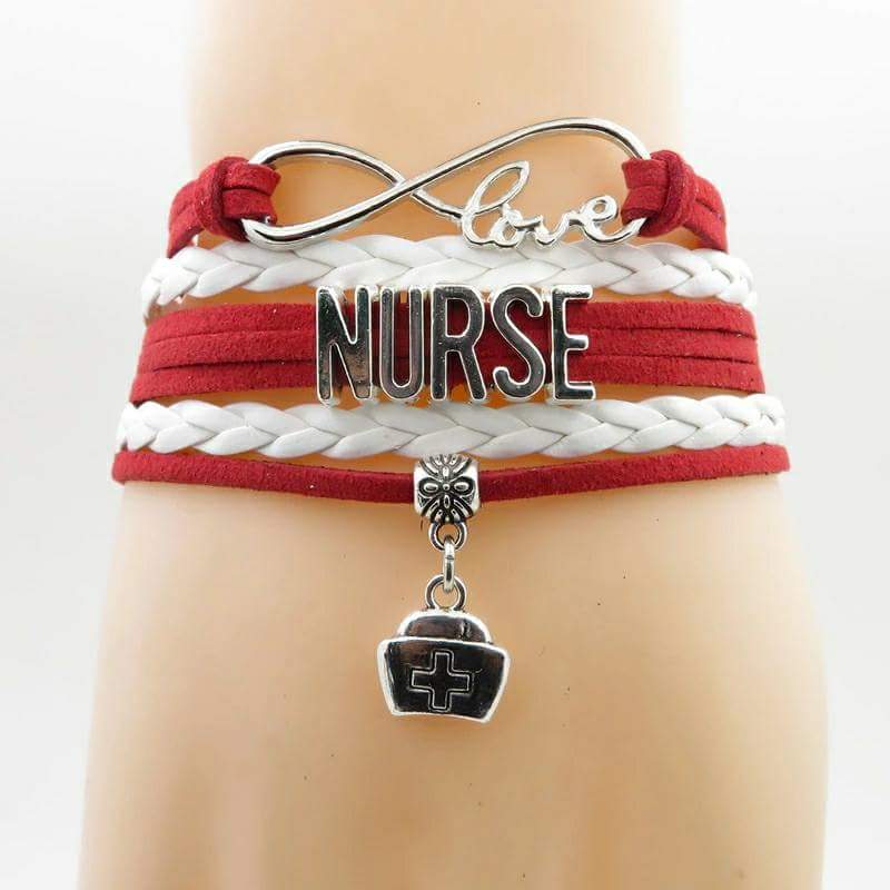 Nurse Wrapped Bracelet. This Bracelet is Red and White. With silver charms. The bracelets come with a adjustable links that will fit up to a 9" wrist. There is a silver color lobster clasp.