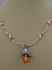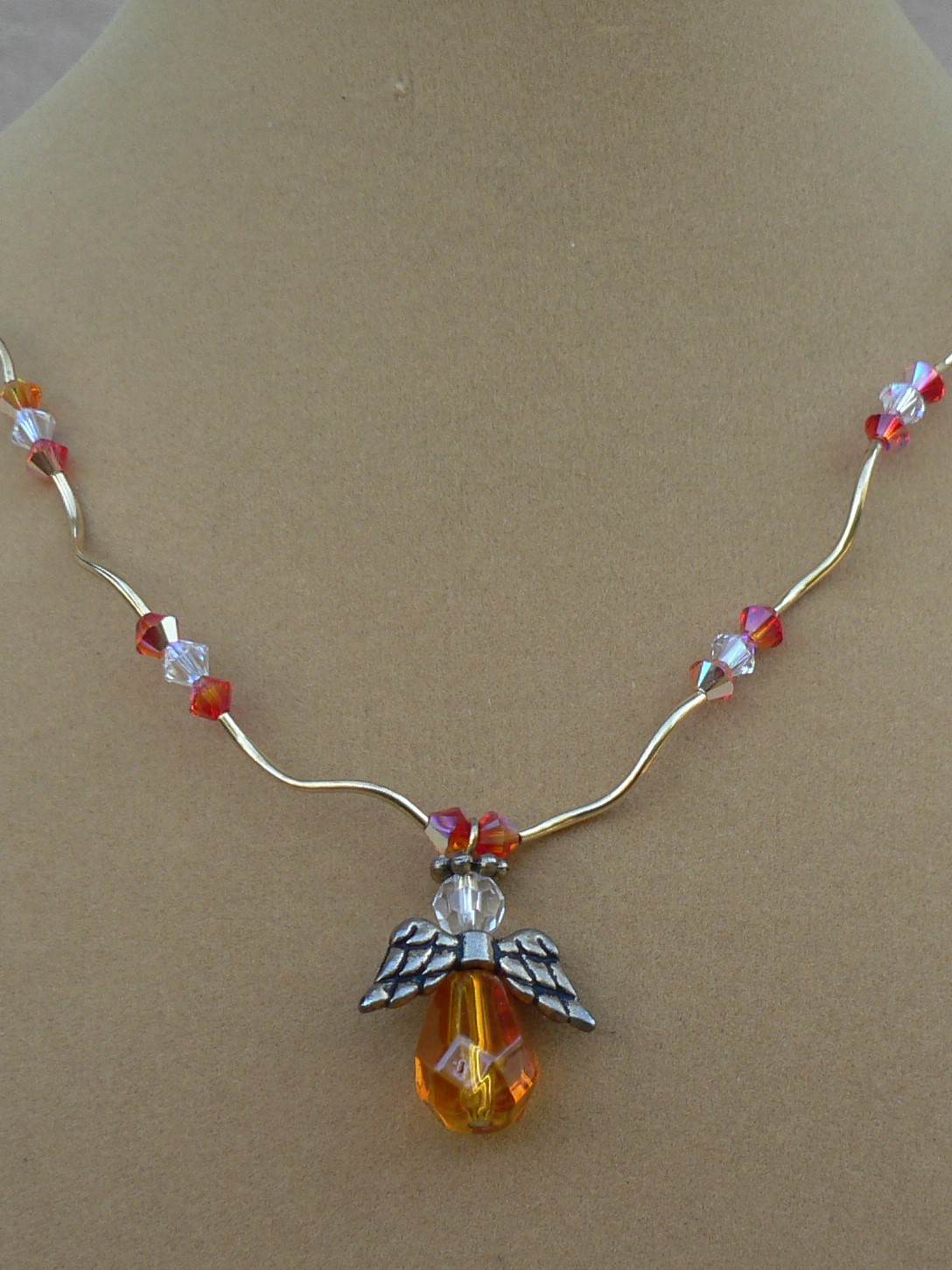 Here is a Orange AB Angel Necklace. The wing is gold plated with a orange bead for the body and a clear bead for the head to make an angel. There is Fireopal AB Swarovski Crystal Bicone with Crystal Swarovski AB Bicone. There is gold plated wavy tubes in between the Swarovski Crystal. The necklace is 20" long with 3" gold plated extension chain. There is a gold plated magnet with a gold plated lobster clasp.