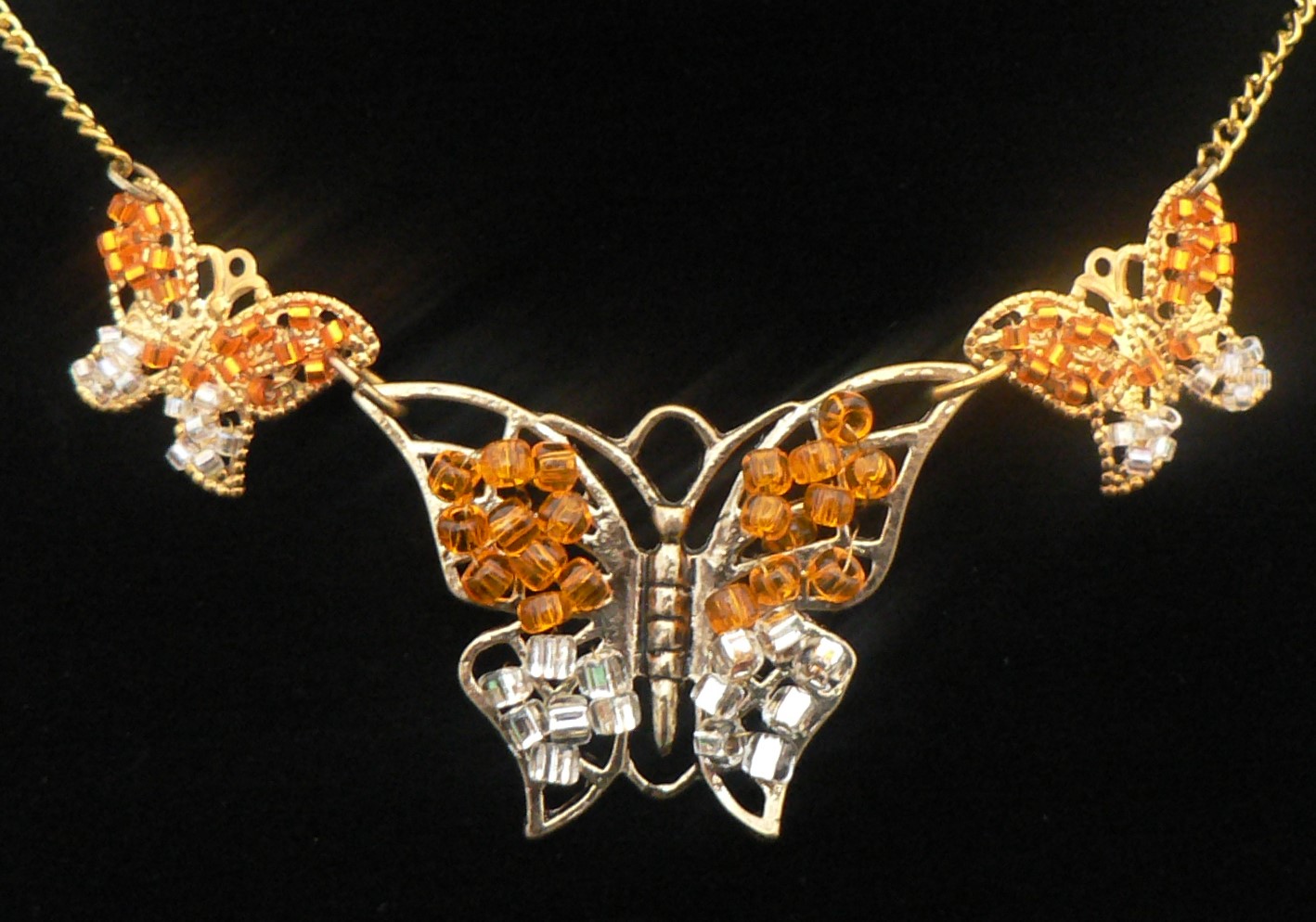 Here is a beautiful necklace. This is a one of a kind. And the reason that this necklace is one of a kind is because the orange and white beads are all hand beaded on the butterfly. Meaning no necklace can be the same. This is a Orange and White Beaded Butterfly Necklace. With one large orange and white beaded butterfly and 2 small orange and white beaded butterflies. Then there is a beautifully gold plated chain to make the necklace. The necklace is 16" long with a 2" extension chain. There is a gold plated magnet and a gold plated lobster clasp. A great necklace to wear everyday or a night out.