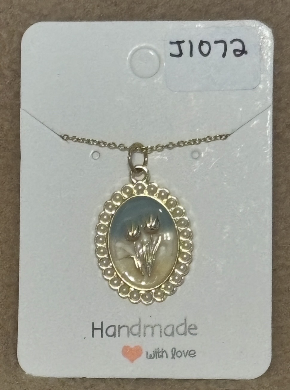 Here is an oval necklace with petals around the oval. There are tulips on the necklace. It has a blue and white background. The backing of the charm is gold color. The chain is gold color. The chain is 17” with a 20 extension chain.
