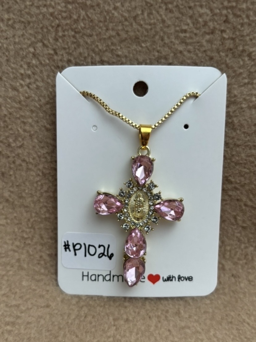 Here is a pink stone cross necklaces. The back of the cross and the chain is gold color. The chain is 17” with a 2” extension chain.