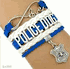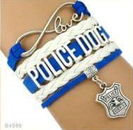 Police Dog Wrapped Bracelet. This Bracelet is Royal Blue and White. With silver charms. The bracelets come with a adjustable links that will fit up to a 9" wrist. There is a silver color lobster clasp.
