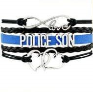 Police Son Wrapped Bracelet. This Bracelet is Black and Royal Blue. With silver charms. The bracelets come with a adjustable links that will fit up to a 9" wrist. There is a silver color lobster clasp.