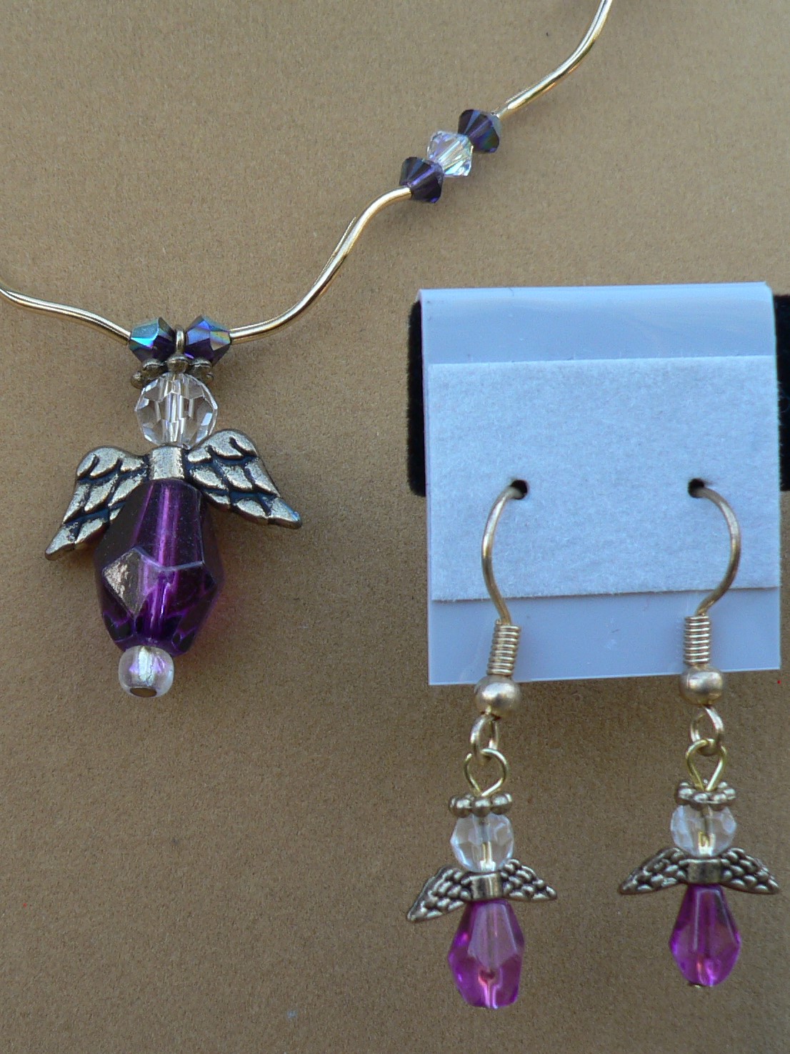 Here is a Purple Angel Necklace. The wings are gold plated with a purple bead for the body and a clear bead for the head. There is Purple Velvet AB Swarovski Crystal Bicone and Crystal Swarovski AB Bicone. There is gold plated wavy tubes in between the Swarovski Crystal. The necklace is 20" long with a 3" gold plated extension chain. On the end for this extension chain is 3 Swarovski Crystals. There is 2 Jet Swarovski Crystal Bicone and 1 Crystal Swarovski AB Bicone in the middle. There is a gold plated magnet and a gold plated lobster clasp. With the earring, the wings are gold plated with purple bead for the body and a clear bead for the head. Normally the earrings cost $7.50 but when you buy the earrings and necklace together, you only pay $30.00 for the set.