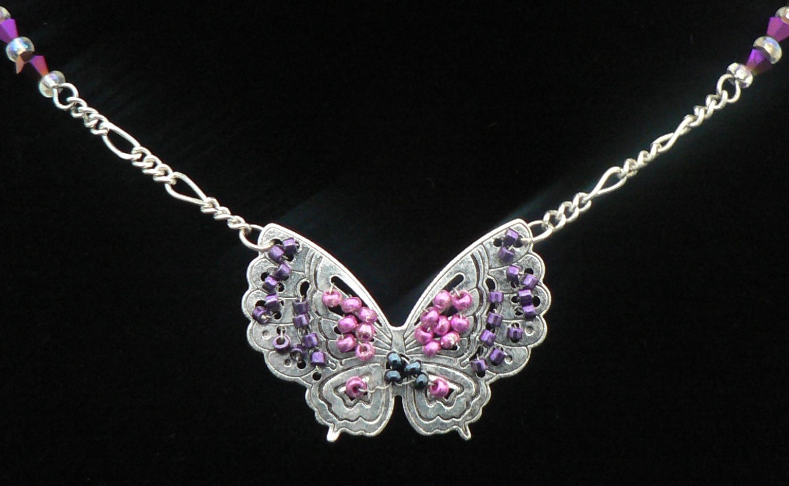 Here is a Purple and Light Purple Silver Plated Butterfly. The Seed Beads are hand beaded on the butterfly. No butterfly is the same because of the beads being hand beaded on the butterfly. The chain on the necklace has Purple Iris Beaded in-between the AB Clear Seed Beads. In-between the beads is silver plated chain. There is a silver plated lobster clasp and silver plated magnet. The necklace is 17 1/2" long with a silver plated 2" extension chain.