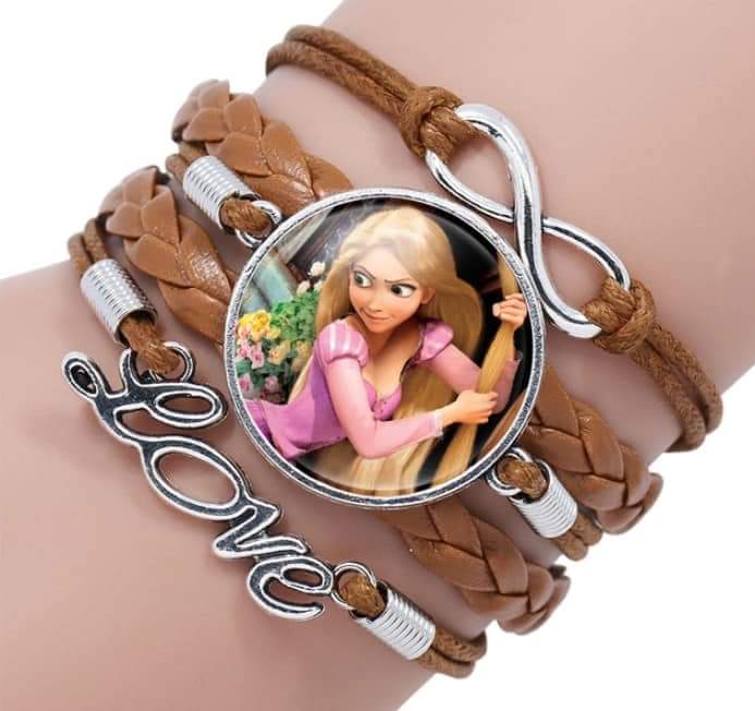 Rapunzel Wrapped Bracelet. This Bracelet is Saddle Brown. With a Rapunzel Charm. The bracelets come with a adjustable links that will fit up to a 9" wrist.
