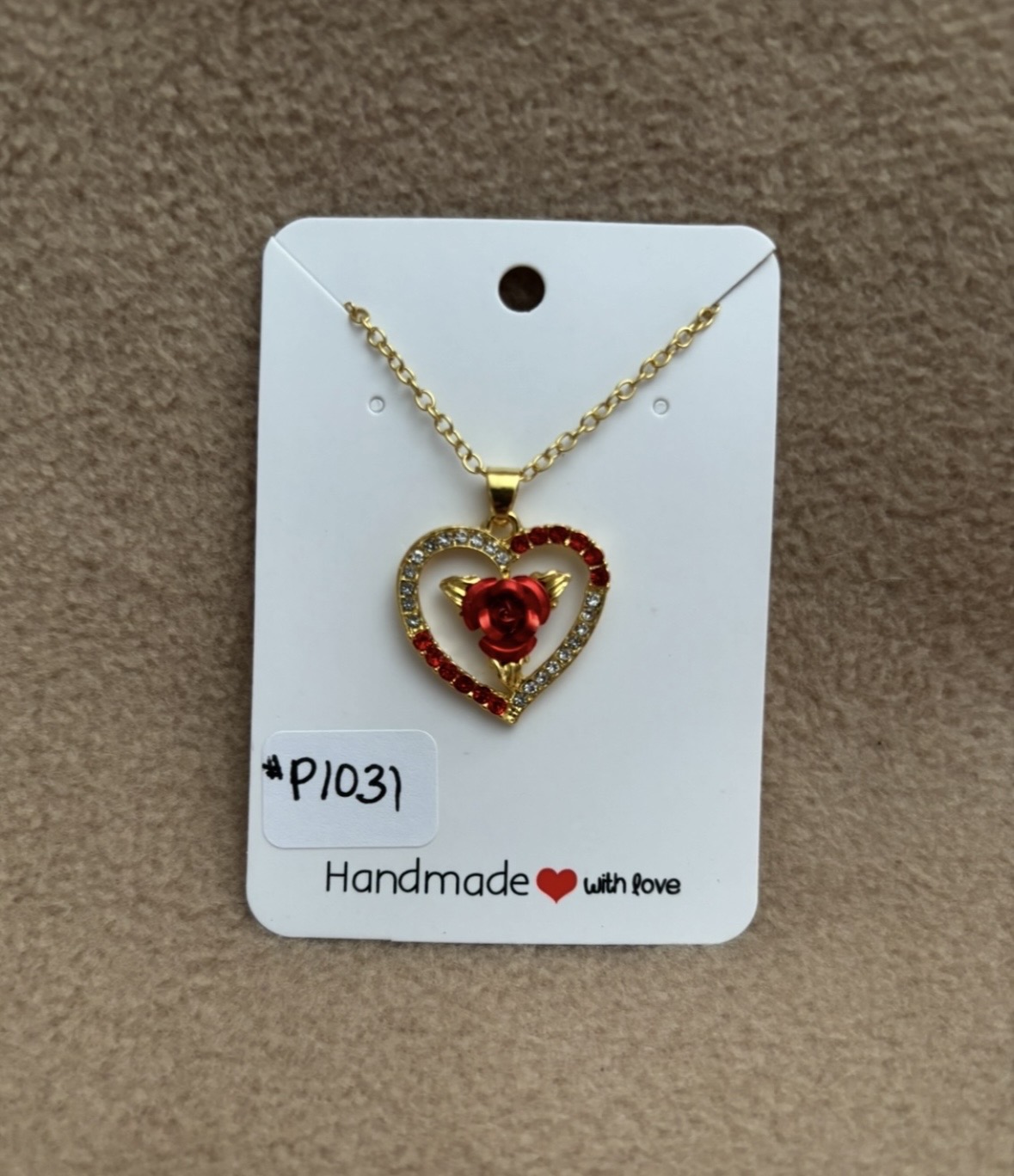 Here is a red rhinestone heart with a red rose in the middle. This is a gold tone necklace. The necklace chain is 17”. What a beautiful gift this would make or a gift for yourself.