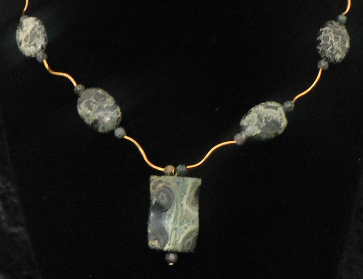 Here is a Bloodstone Light Green Gem Rectangle Pendent. There is Oval and Round beads in-between gold plated wavy tubes. The necklace is 18" long and 2" extension chain. There is a gold plated magnet and gold plated lobster clasp.