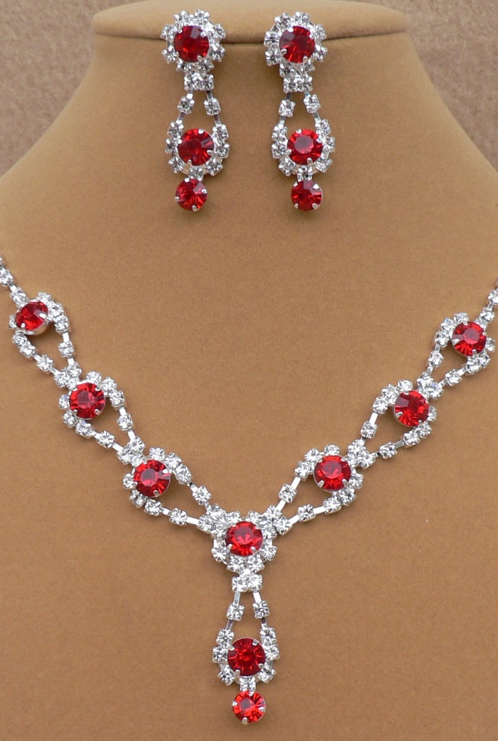 Woman's Handmade Rhinestone Red Crystal Tear Drop Earrings Elegant Necklace. This necklace is brought from a supplier. We use the suppliers description on the website. The necklace and earrings are sold as a set.