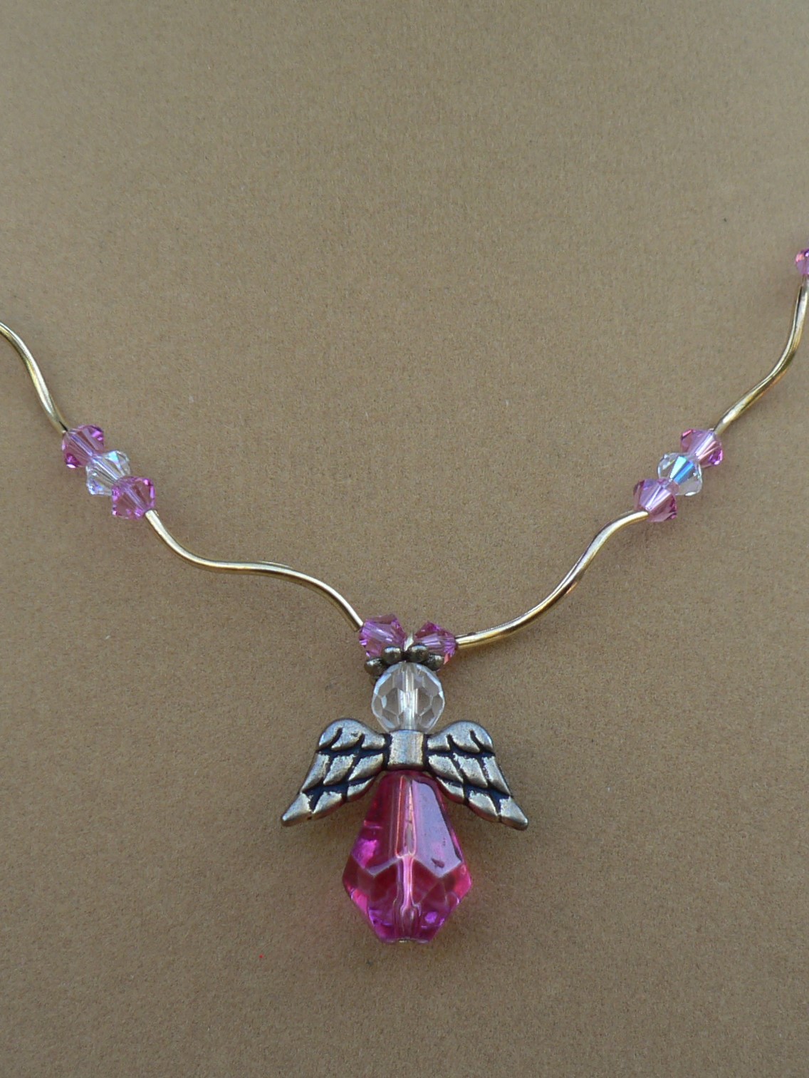 Here is a Rose Angel Necklace. The wing is gold Plated with a rose bead for the body and a clear bead for the head to make an angel. There is Rose Swarovski Crystal Bicone with Crystal Swarovski AB Bicone. There is gold plated wavy tubes in between the Swarovski Crystal. The necklace is 20" long with a 3" gold plated extension chain. There is a gold plated magnet with a gold plated lobster clasp.
