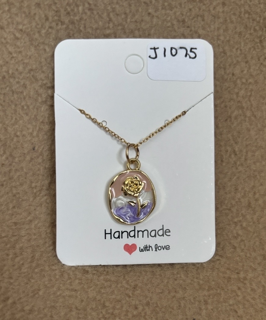 Here is an oval necklace with a rose flower z the background is peach, white and purple. The backing of the charm is gold color. The chain is gold color. The chain is 17” with a 2” extension chain.