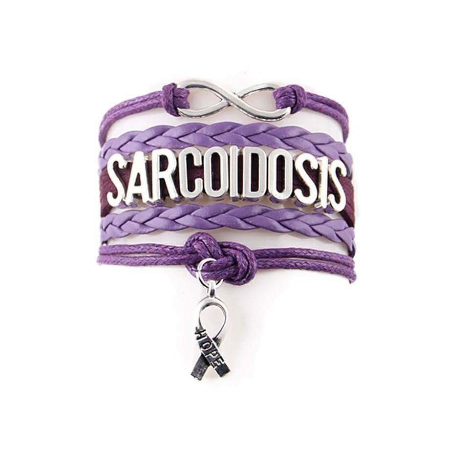 Sarcoidosis Wrapped Bracelet. This Bracelet is Purple and Light Purple. With silver charms. The bracelets come with a adjustable links that will fit up to a 9" wrist. There is a silver color lobster clasp.