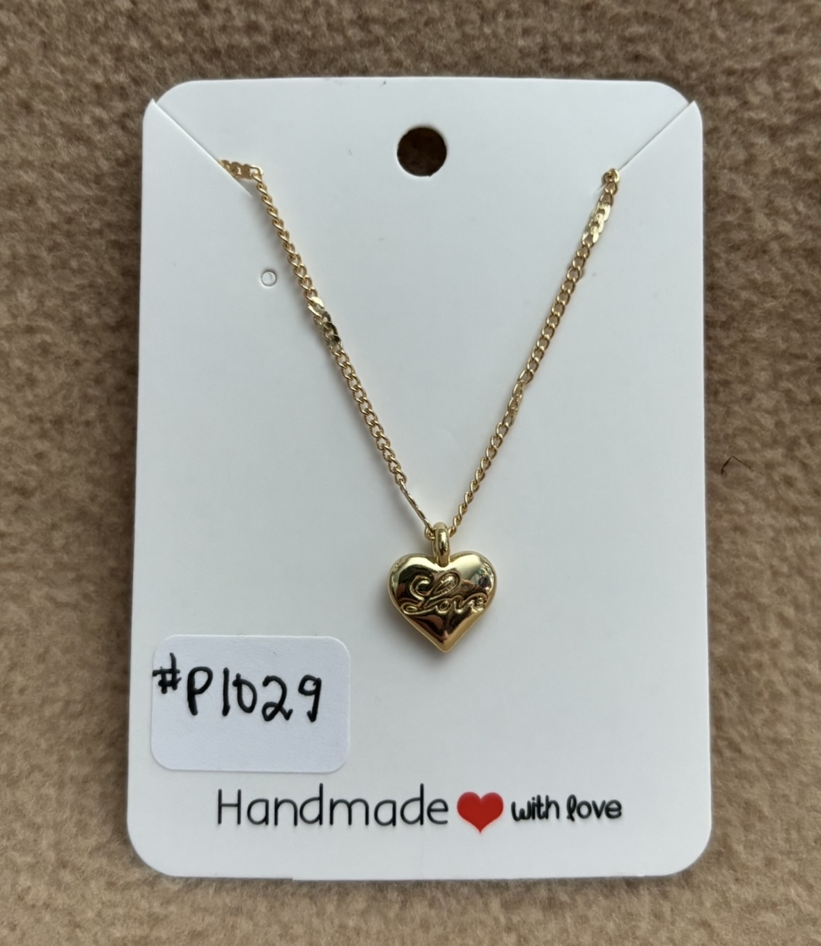 Here is a small gold color heart necklace. The heart says Love. The chain is 18” long with a 2” extension chain.