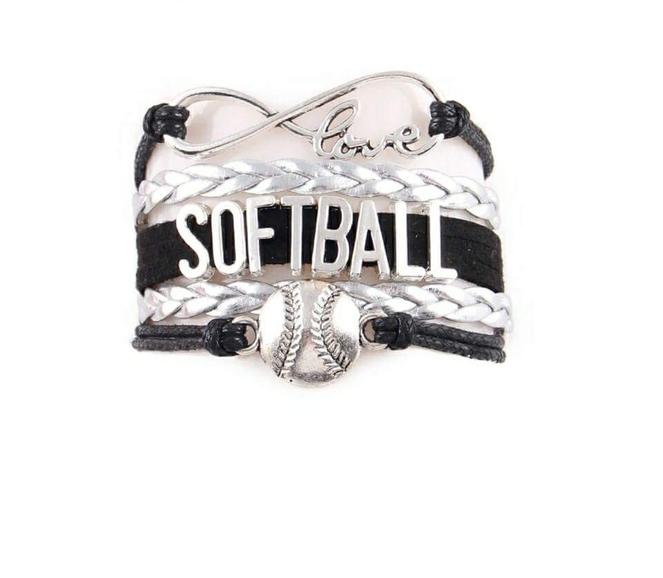 Softball Wrapped Bracelet. This Bracelet is Black and Silver. With silver charms. The bracelets come with a adjustable links that will fit up to a 9" wrist. There is a silver color lobster clasp.