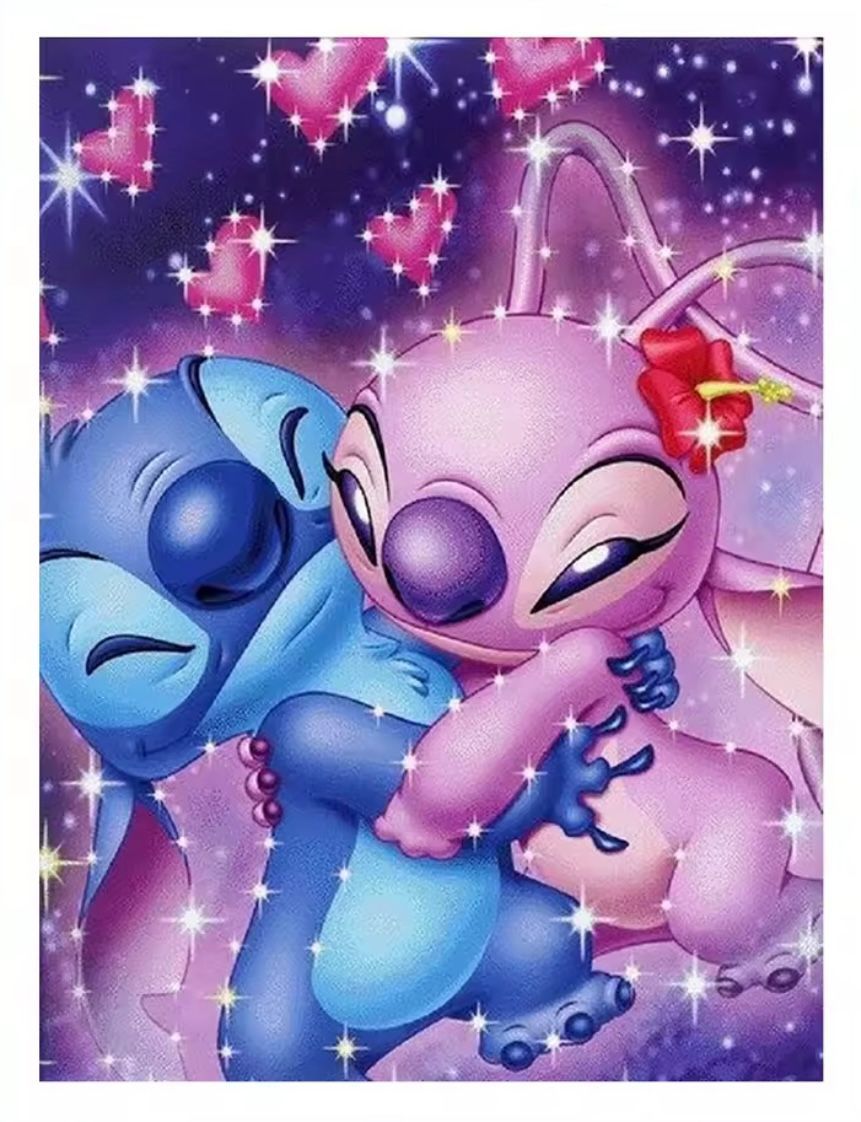Stitch And Angel Hugging Diamond Painting Kit. Size is approximately 20cm by 30cm. The kits come with a picture, diamond dots, tray, tool and wax. This is a full picture with round diamond dots.