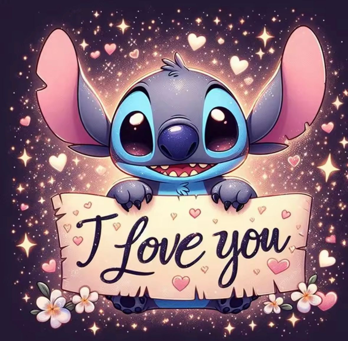 Stitch With I Love You Diamond Painting Kit. Size is approximately 20cm by 20cm. The kits come with a picture, diamond dots, tray, tool and wax. This is a full picture with round diamond dots.