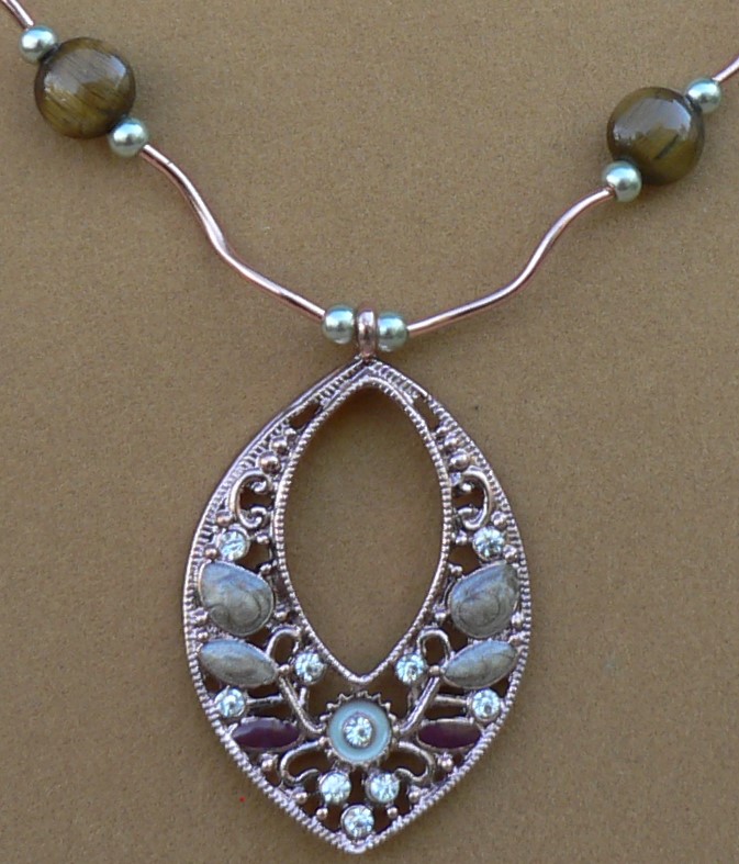 There is a Copper Teardrop Necklace. There is flat round tiger-eye bead with green round beads. There is copper wavy tubes in between the beads. The necklace is 19" long with a 3" copper extension chain. There is a copper magnet with a copper lobster clasp.
