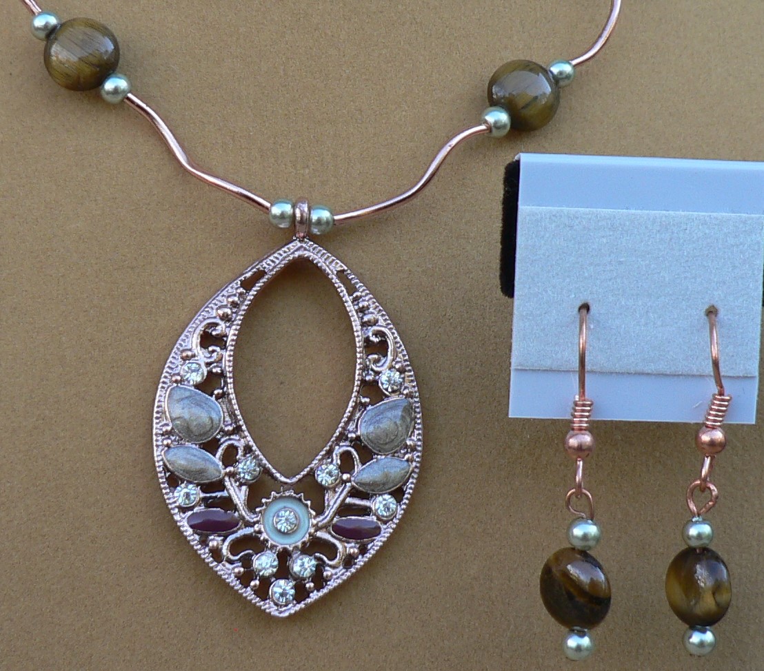There is a Copper Teardrop Necklace. There is flat round tiger-eye bead with green round beads. There is copper wavy tubes in between the beads. The necklace is 19" long with a 3" copper extension chain. There is a copper magnet with a copper lobster clasp. Normally the earrings cost $7.50 but if you buy the earrings and the necklace together, you save $2.50. You only pay $40.00 for the set.