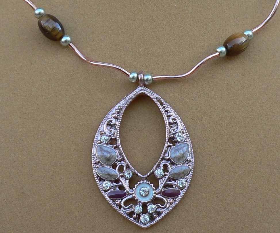 There is a Copper Teardrop Necklace. There is oval tiger-eye bead with green round beads. There is copper wavy tubes in between the beads. The necklace is 19" long with a 3" copper extension chain. There is a copper magnet with a copper lobster clasp.