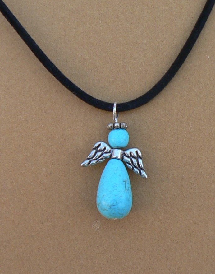 Here is a Turquoise Angel Pendent. There is a black corded necklace chain. The cord is 16" long with a 2" extension chain. There is a silver plated lobster clasp. If you need a longer chain, please email us. We might be able to find a long cord.