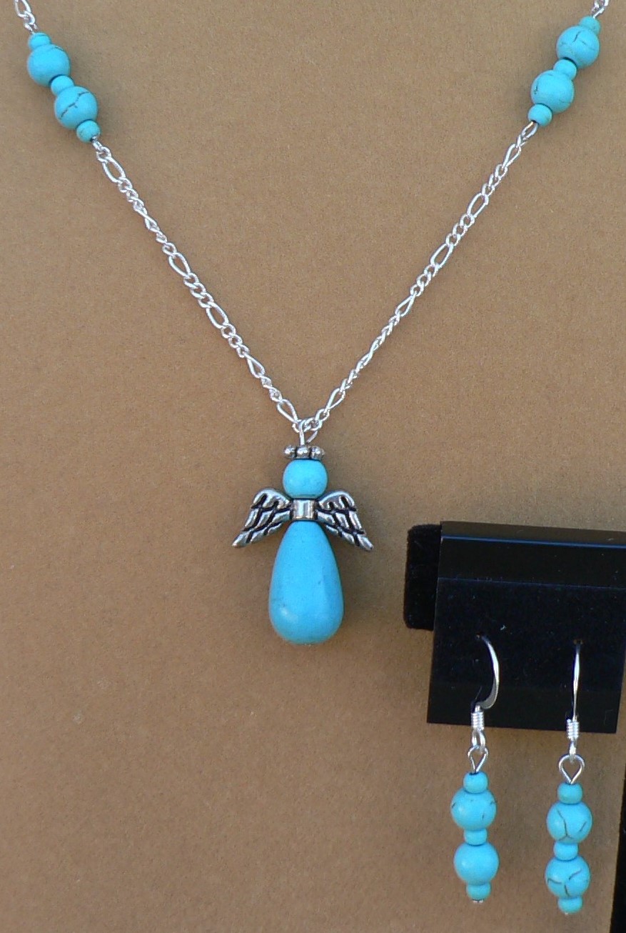 Here is a Turquoise Angel Necklace Set. This necklace has a turquoise angel. There is beads in-between the chain. The chain is nickel free. There is a silver plated magnet and lobster clasp. The necklace is 16" long with a 2" extension chain. Normally the earrings cost $7.50. When you buy the necklace and earrings together. You only pay $40.00 for the set.