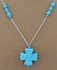 Here is a Turquoise Cross Necklace. This necklace has a turquoise cross. There is beads in-between the chain. The chain is nickel free. There is a silver plated magnet and lobster clasp. The necklace is 16" long with a 2" extension chain.