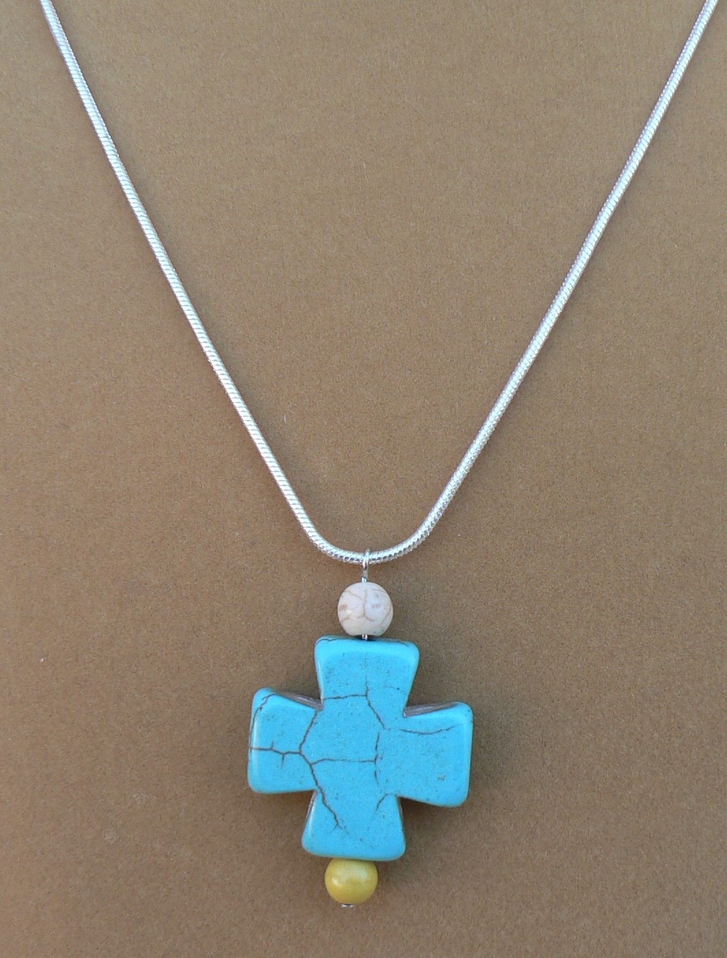 Here is a Turquoise Cross Pendent. The necklace chain is nickel free. There is 6mm round white bead on the top and a yellow bead on bottom of the cross. The chain is 16" long with a 3" extension chain. There is a silver plated lobster clasp.
