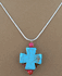 Here is a Turquoise Cross Pendent. The necklace chain is nickel free. There is 6mm round Pink bead on the top and a orange bead on bottom of the cross. The chain is 16" long with a 3" extension chain. There is a silver plated lobster clasp.