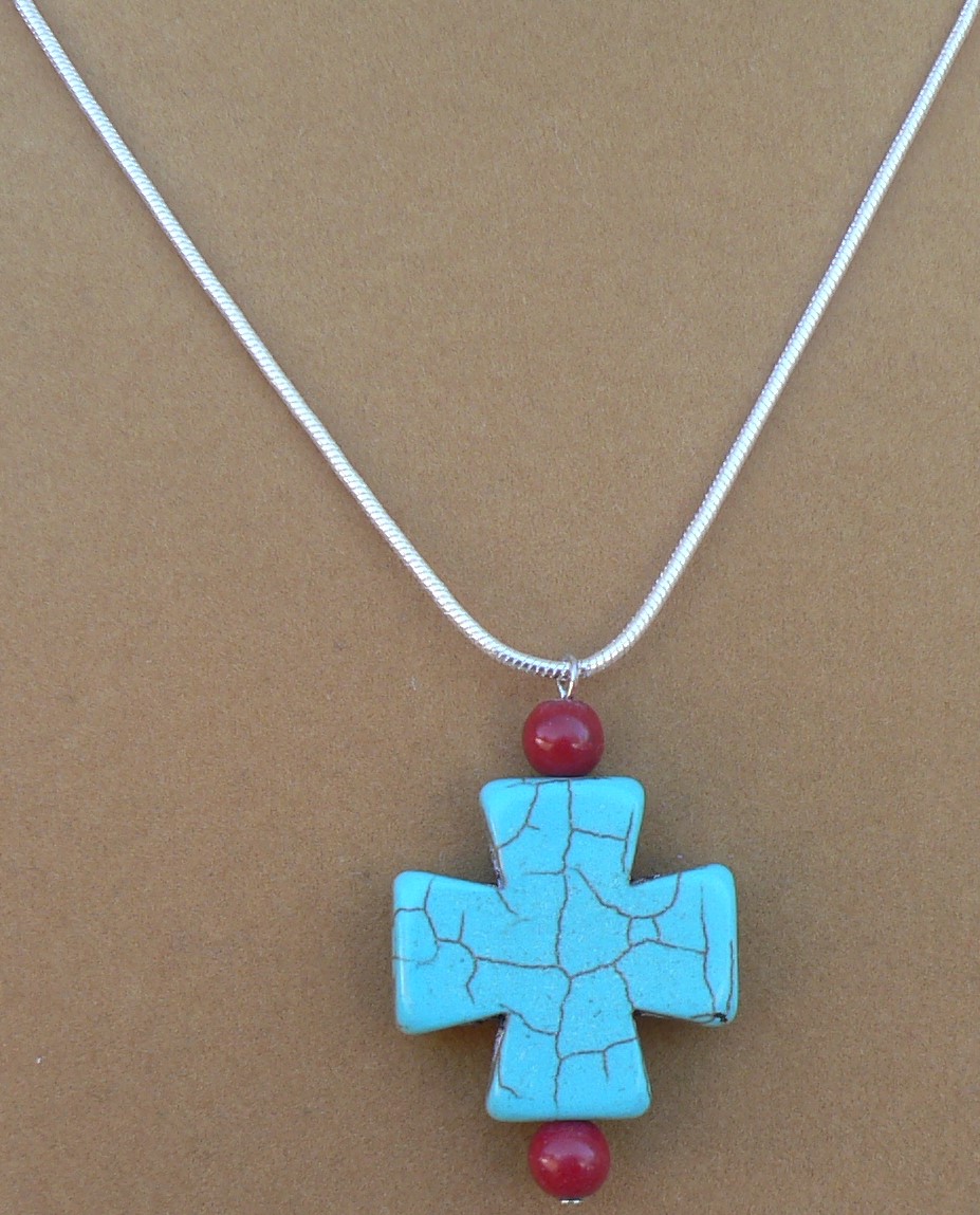 Here is a Turquoise Cross Pendent. The necklace chain is nickel free. There is 6mm round red bead on the top and on bottom of the cross. The chain is 16" long with a 3" extension chain. There is a silver plated lobster clasp.