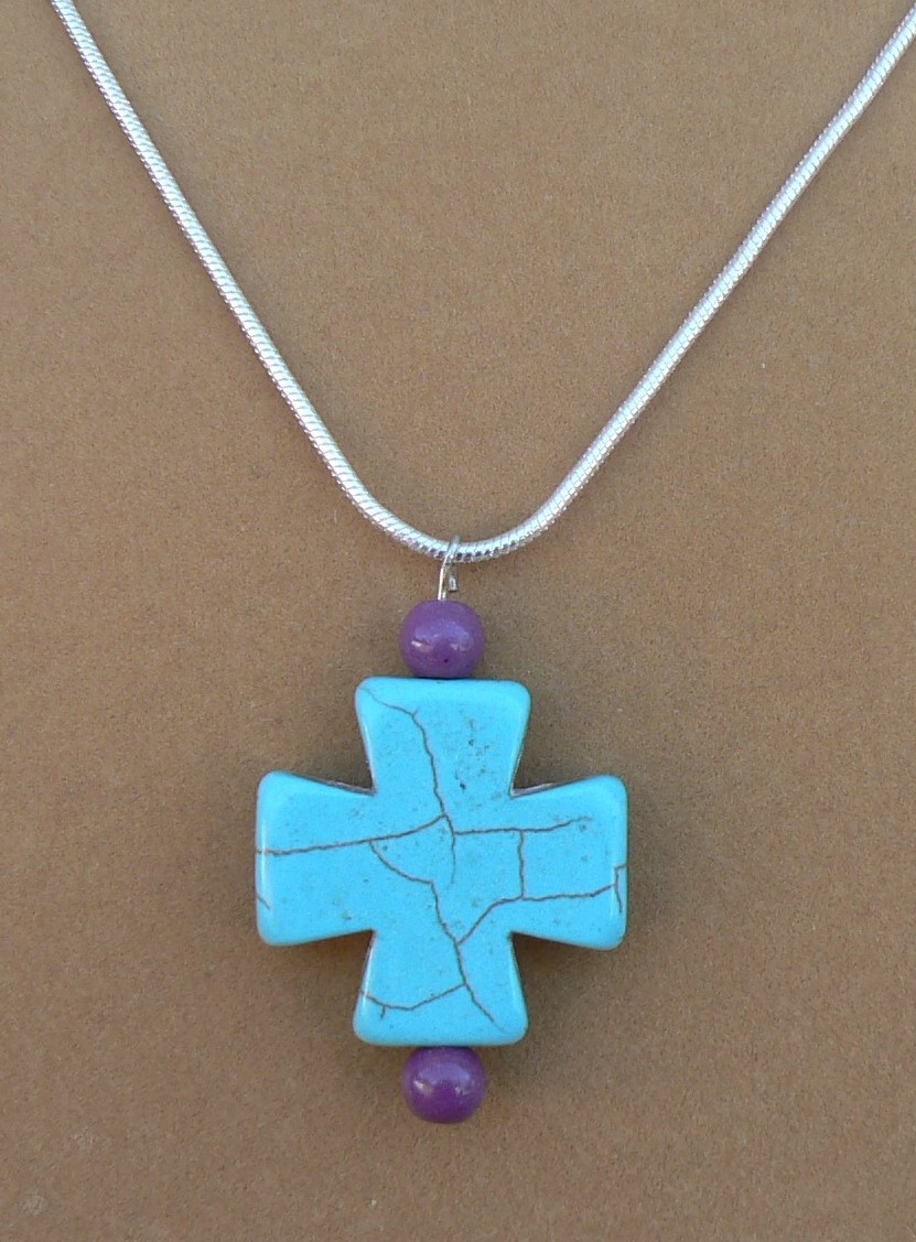 Here is a Turquoise Cross Pendent. The necklace chain is nickel free. There is 6mm round purple bead on the top and on bottom of the cross. The chain is 16" long with a 3" extension chain. There is a silver plated lobster clasp.