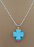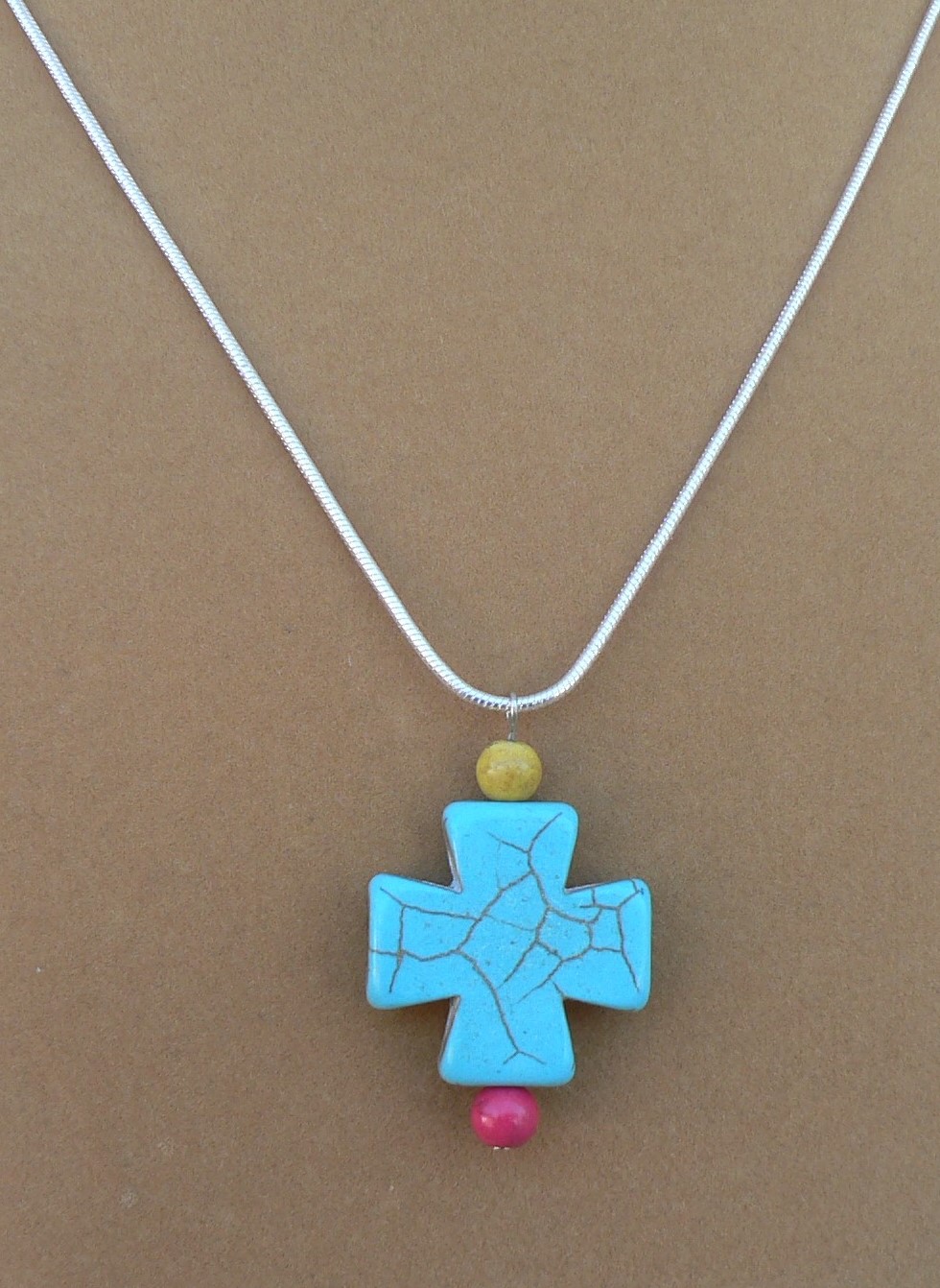 Here is a Turquoise Cross Pendent. The necklace chain is nickel free. There is 6mm round yellow bead on the top and a pink bead on bottom of the cross. The chain is 16" long with a 3" extension chain. There is a silver plated lobster clasp.