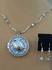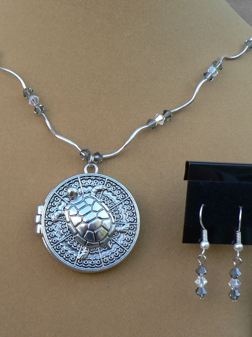 Here is a Turtle Locket Necklace. There is Black Diamond and Crystal AB Swarovski Crystal. There is silver color wavy tubes in-between the Swarovski Crystals. The necklace is 20" long with a 3" silver color extension chain. There is a silver color magnet with a silver color lobster clasp. Normally the earrings cost $7.50 but if you buy the earrings and necklace as a set, you save $2.50. You pay only $40.00 for the set.