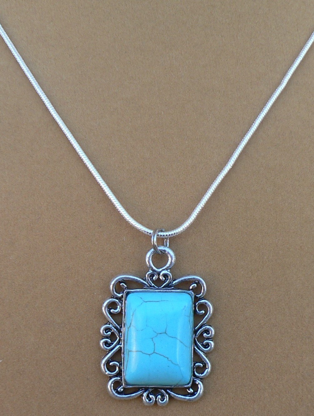 Here is a Turquoise Square Pendent. There is a silver square with a square turquoise in the middle. The necklace chain is nickel free. The chain is 16" long with a 3" extension chain. There is a silver plated lobster clasp. This is such a beautiful piece.