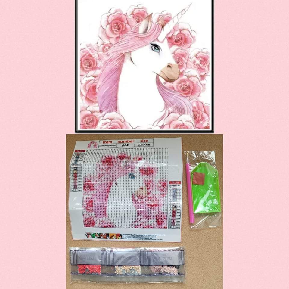 Here is a Unicorn Diamond Painting. Kits come with picture, diamond dots, tool, tray and sticky wax. Size of the picture is 20 by 20cm.