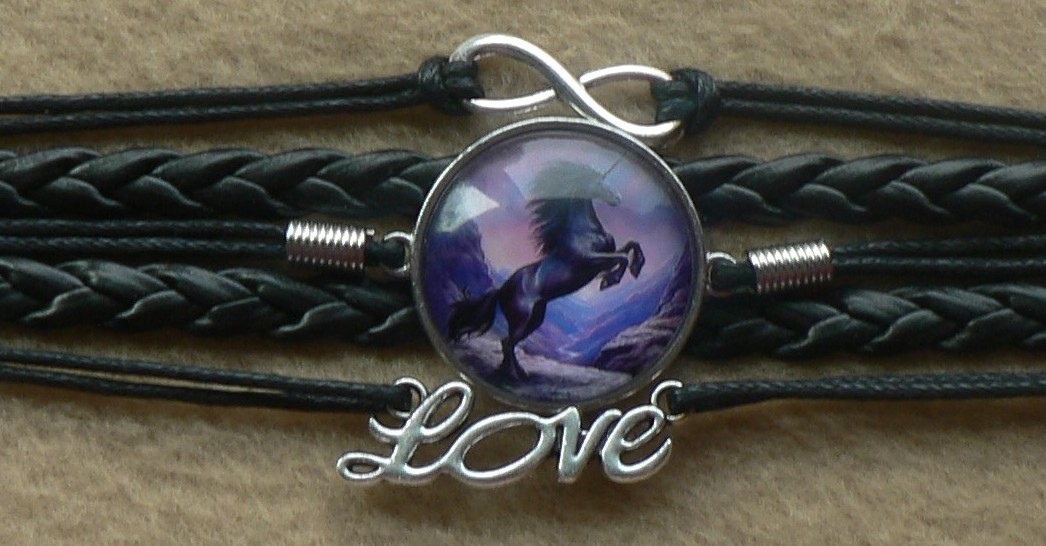 Here is a Unicorn Photo Glass Cabochon Leather Charm Wrap Bracelet. There is a color unicorn charm in the middle. The bracelets is black. There is a infinity charm on top of the bracelet and a love charm on the bottom. The bracelet is 6 1/2" long with a silver plate 2" extension chain. There is a silver color lobster clasp.