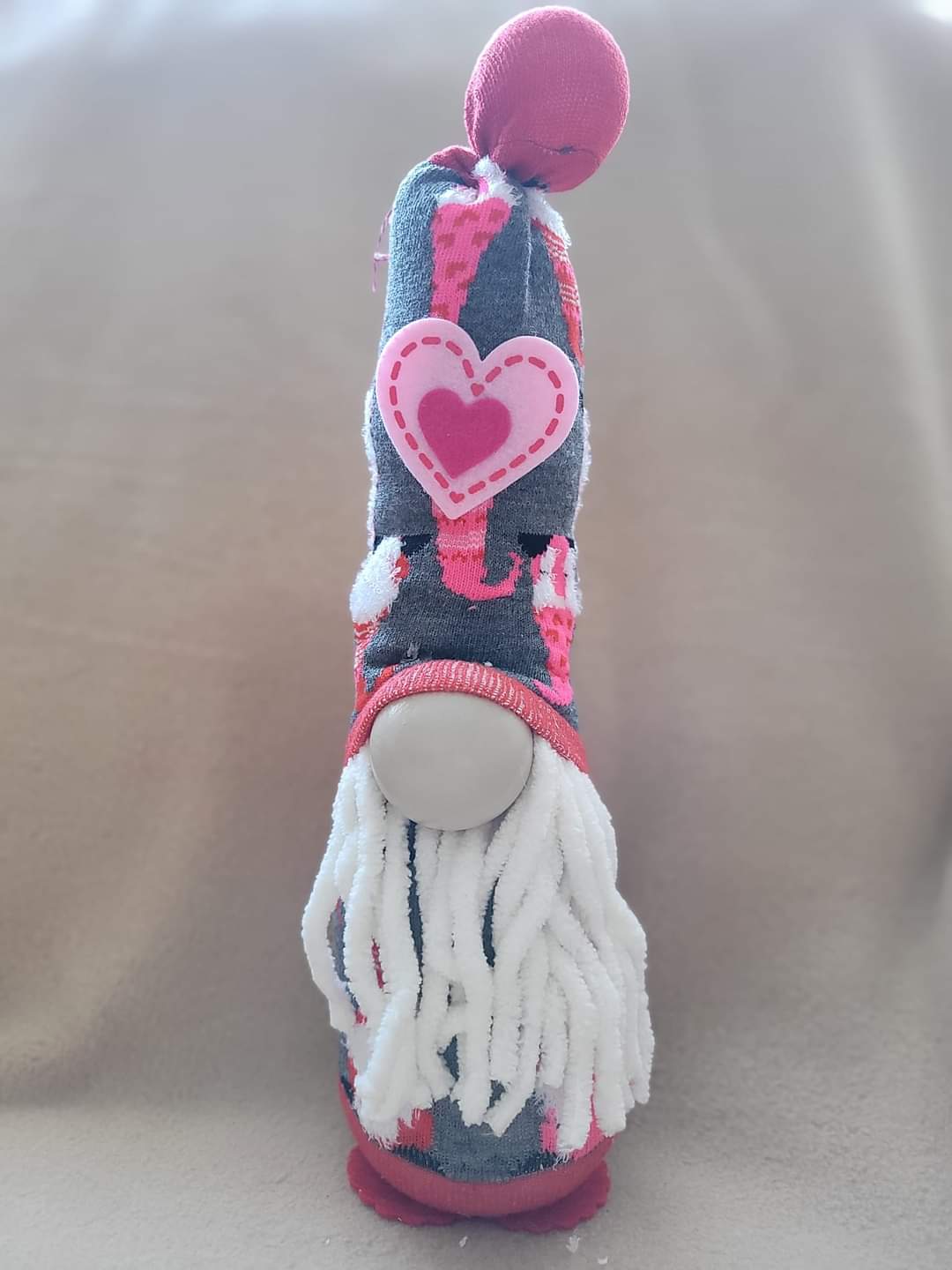 Here is a Valentine's Day Gnome with a white beard. Measurements are approximate Width 3 1/2", Depth 4 1/2", Height 12". These gnomes are made out of socks, stuffing, felt heart and ping pong balls.