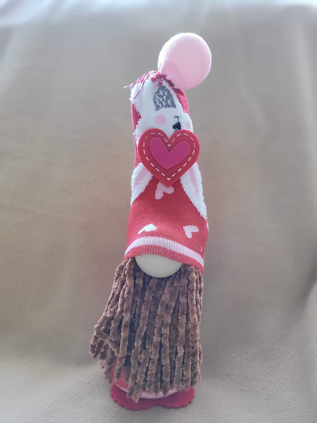 Here is a Valentine's Day Gnome with bunny and a brown beard. Measurements are approximate Width 4", Depth 4 1/2", Height 12 1/2". These gnomes are made out of socks, stuffing, felt heart and ping pong balls.