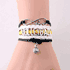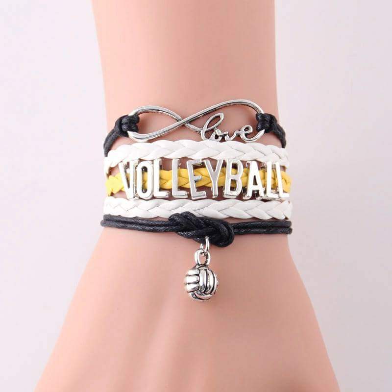 Volleyball Wrapped Bracelet. This Bracelet is Black, White and Yellow. With silver charms. The bracelets come with a adjustable links that will fit up to a 9" wrist. There is a silver color lobster clasp.