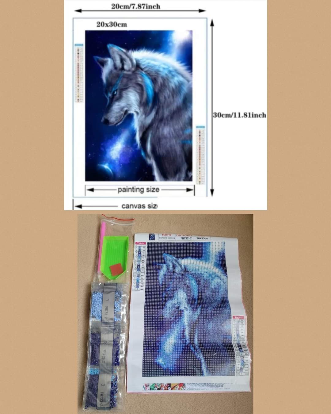 Here is a Wolf Diamond Painting. Kits come with picture, diamond dots, tool, tray and sticky wax. Size of the picture is 20 by 30cm.