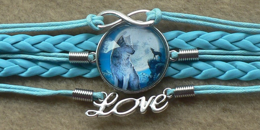 Here is a Wolf Time Gemstone Multilayer Leather Wrap Bracelet. There is a color wolf charm in the middle. The bracelets is blue. There is a infinity charm on top of the bracelet and a love charm on the bottom. The bracelet is 6 1/2" long with a silver plate 2" extension chain. There is a silver color lobster clasp.