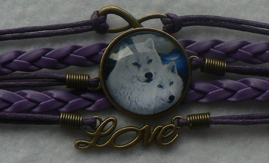 Here is a Wolf Time Gemstone Multilayer Leather Wrap Bracelet. There is a color wolf charm in the middle. The bracelets is purple. There is a infinity charm on top of the bracelet and a love charm on the bottom. The bracelet is 6 1/2" long with a antique copper plate 2" extension chain. There is a antique copper color lobster clasp.