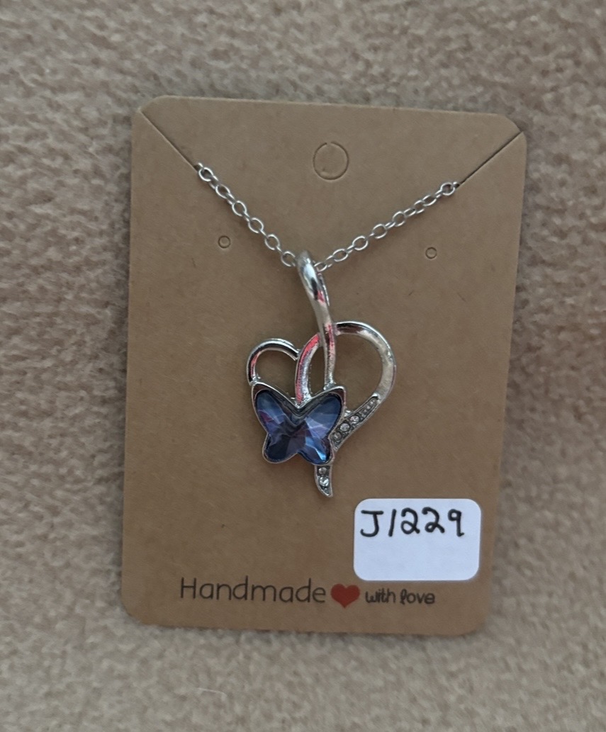 Here is a blue butterfly heart necklace. The great is sliver with clear rhinestones on the great. There is a blue butterfly on the heart. The charm and chain is silver color. The chain is 18”.