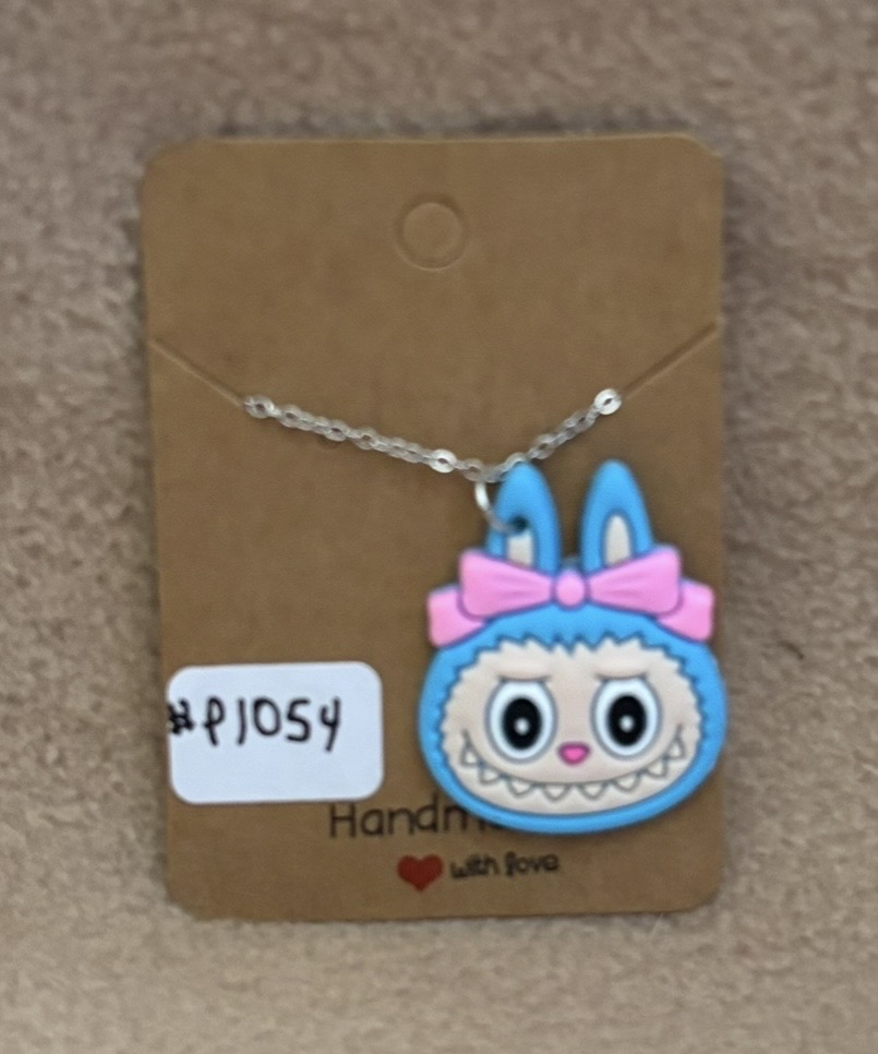Here is a blue Labubu necklace. The head is made of a plastic. It is a blue with a peach face and a light pink bow. The chain is silver color. The chain is 16”.