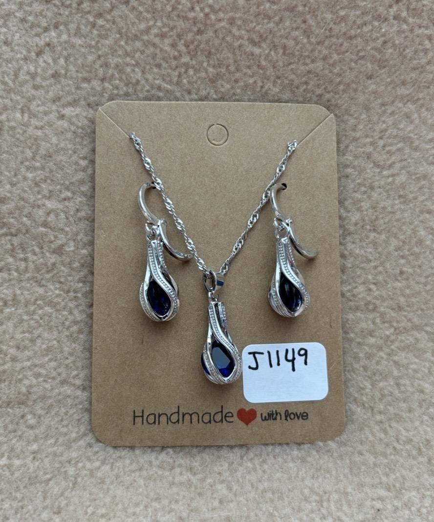 Here is a blue stone necklace set. There is a blue stone in the middle of the .925 silver. There is a necklace and 2 earrings. The silver and the chain is .925 silver. The chain is 17” long.