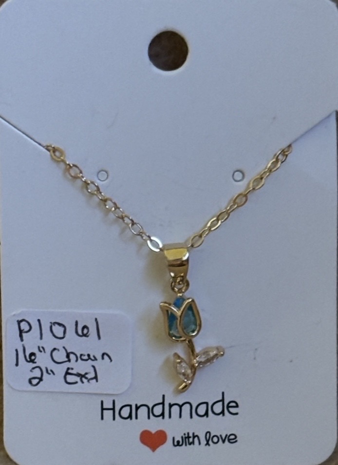Here is a blue tulip necklace. Blue stone for the flower and clear stone for the leaf’s. The flower and the chain is gold color. The chain is 16” with a 2” extension chain.