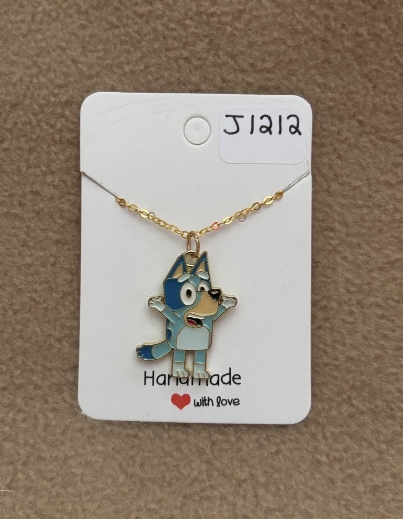 Here is a bluey necklace. Bluey has his arms raised. The charm and chain is gold tone. The chain is 16” long.