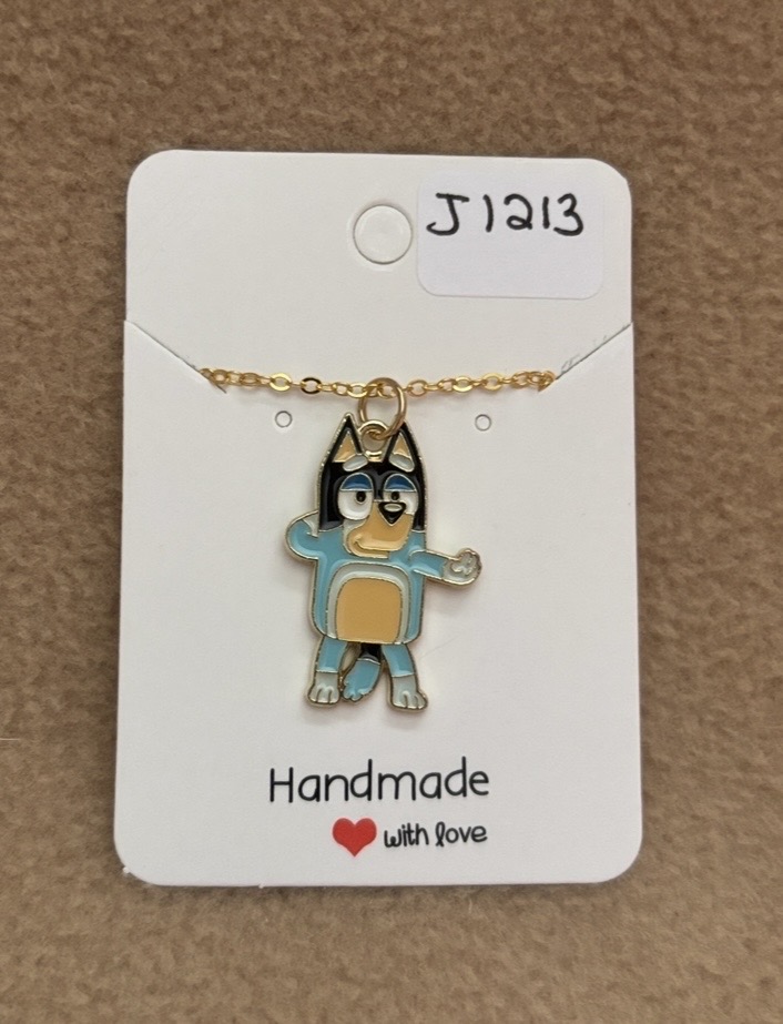 Here is a bluey necklace. Bluey has on hand behind his head and one hand out in from of him. The charm and chain is gold tone. The chain is 16” long.