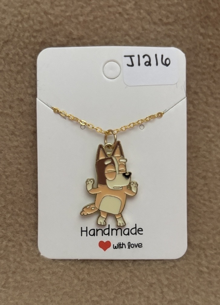 Here is a dancing bingo necklace. The charm and chain is gold tone. The chain is 16” long.